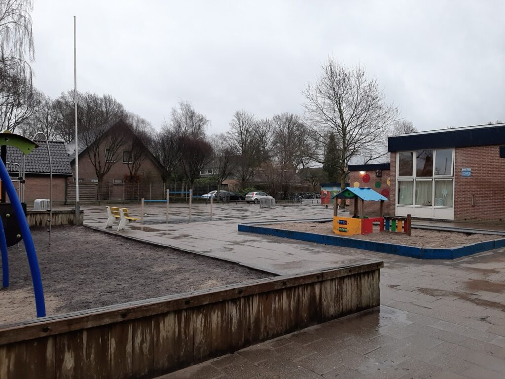 De regenbui is voorbij dus hup naar buiten en spelen maar… Ai, het plein staat vol met plassen… dat is niet handig. Vroeger ging dit water naar het riool, maar nu is het geen afval of overlast meer. We zetten het in als educatie voor scholen. Stap 1 is water weg laten lopen van speelplekken en in bufferzones opslaan. De vervolgstappen maken we samen.